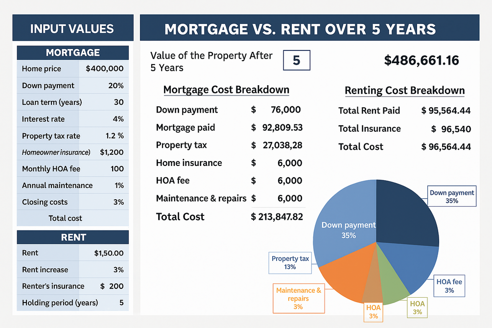 This professional tool helps you compare the long-term costs of renting versus buying, factoring in mortgage payments, rent increases, insurance, taxes, and more — all in one clear, easy-to-use dashboard.